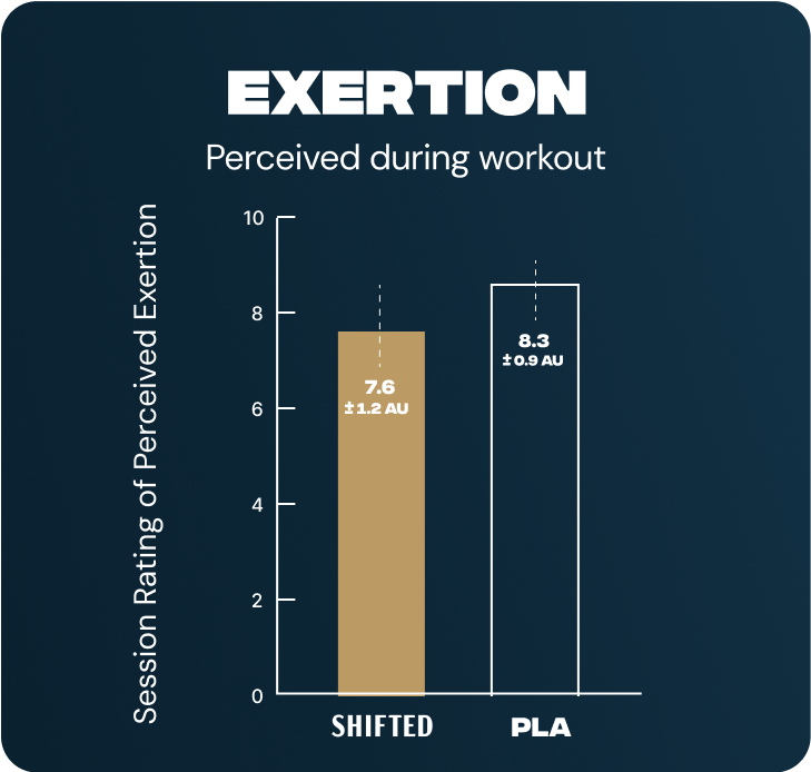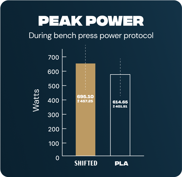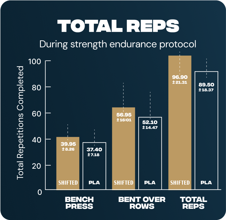 SHIFTED Maximum Pre Workout significantly improved muscle power and endurance during resistance training, while reducing subjective feelings of perceived exertion. Shifted Maximum Pre Workout allows you to do more work and feel better doing it!