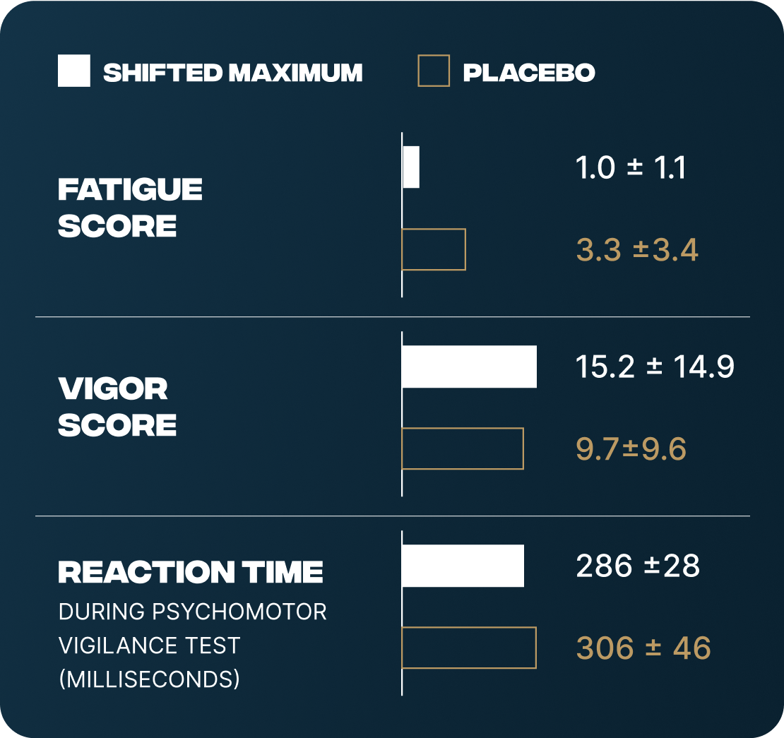 We put our pre workout to the test in 3 randomized, double-blind, placebo-controlled research studies at independent universities. The results speak for themselves. Shifted Maximum significantly improved fatigue, vigor, reaction time, and physical performance.